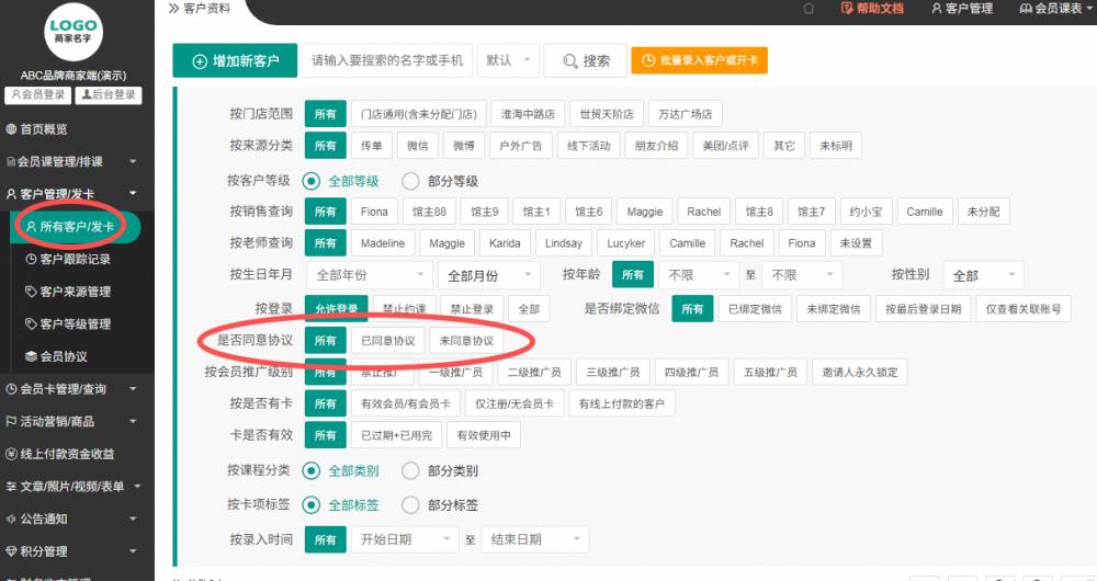 ▼在后台【客户管理-所有客户】菜单,会员的会员卡菜单,可点击打印图标,打印卡项小票或合同协议。