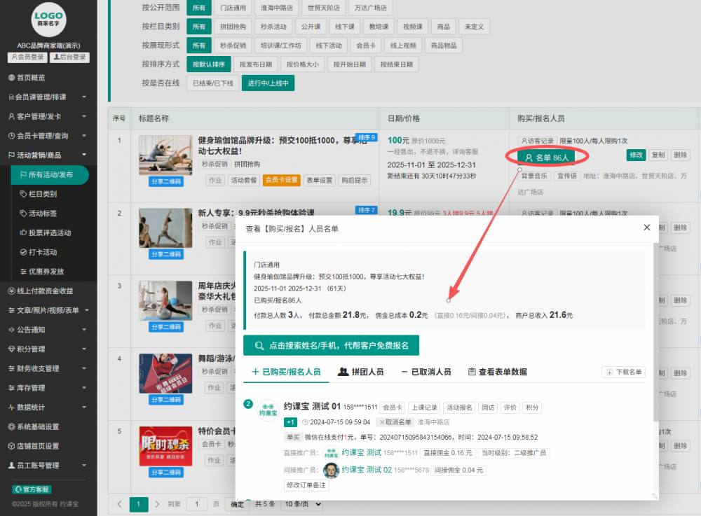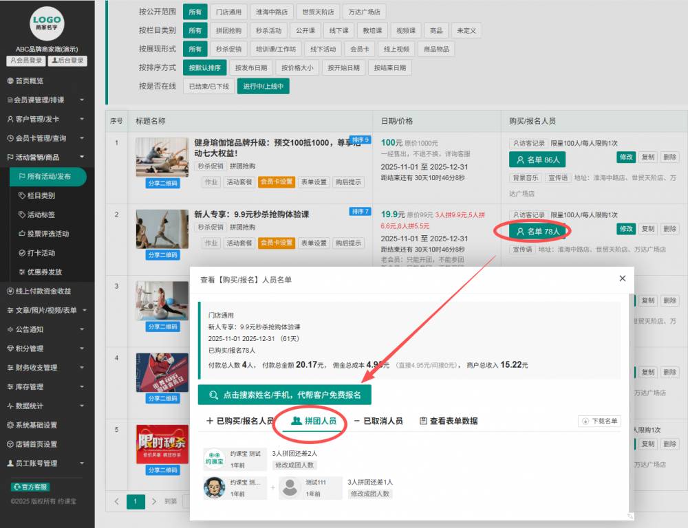 ▼【电脑后台】每个活动都查点“名单”按钮,查看具体的会员报名信息,拼团会员等