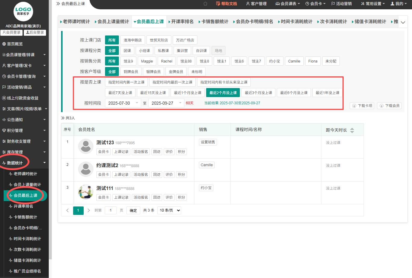 ▼查询指定期限内的哪些会员未上课