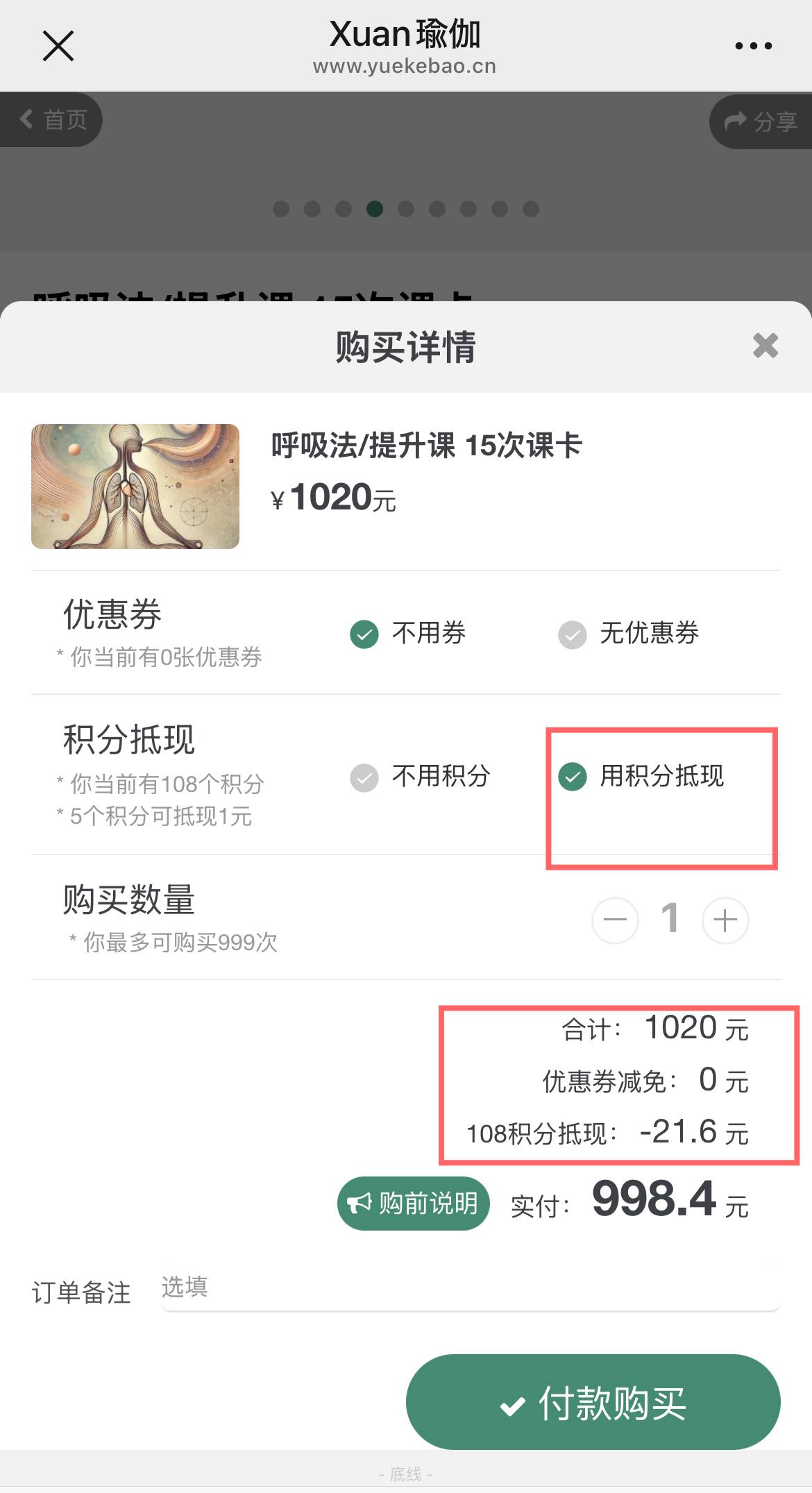 15次课卡 ¥1028元,用 100分 可抵 ¥20