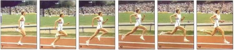 当摆动腿通过身体垂线向前摆动时,支撑腿先伸展髋关节,再迅速有力的伸展膝关节和踝关节。脚掌里的小肌群也要积极发力,最后用脚趾蹬离地面。摆动腿前摆过程中,小腿保持放松并自然下垂。后蹬结束时,支撑腿几乎伸直,摆动腿的小腿与支撑腿几乎平行,跑步的距离越长,大腿抬起高度会越低。