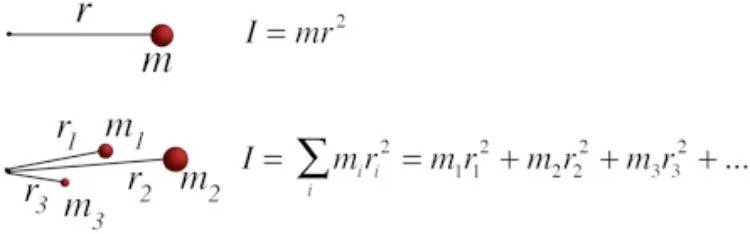 转动惯量的公式为I=mr^2,m和r分别指物体内每个微粒的质量以及它们各自与旋转轴的距离。转动惯量就是所有微粒的质量乘以它们各自离开旋转轴距离平方的总和。物体整体质量越大,转动惯量就越大。